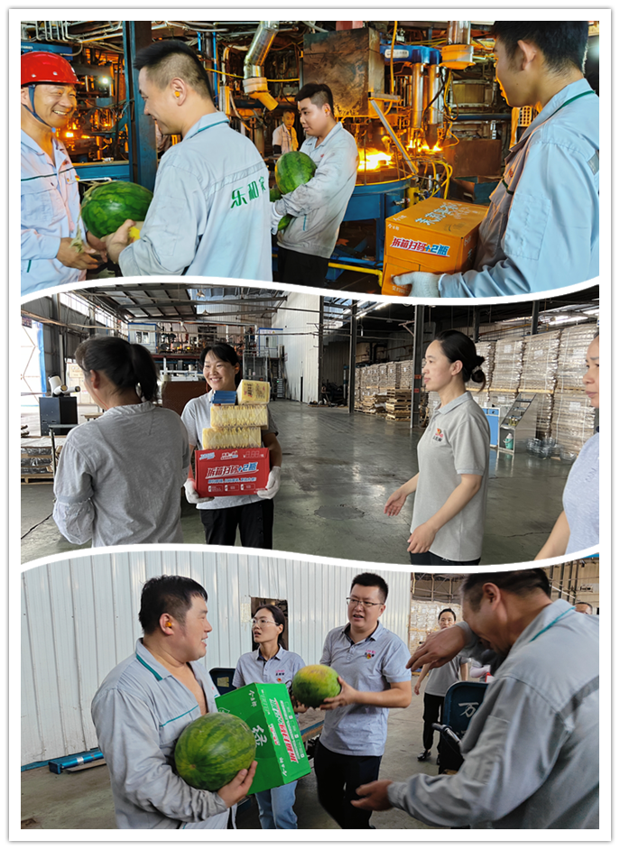 由于曜暉所處行業(yè)比較特殊,從原料粉末、熔化、玻璃液到成品,整個生產(chǎn)流程都需在高溫環(huán)境下實現(xiàn)。合影結束后,黨員代表深入車間現(xiàn)場開展迎“七一”送清涼活動,將濃濃關懷送到職工心坎上,代表們來到車間,把清涼的大西瓜、飲料、菊花茶等防暑降溫物品送到員工手中,為他們帶去絲絲涼意。雖然工作環(huán)境高溫悶熱,但工人們認真積極工作的態(tài)度始終如一,令人敬佩。